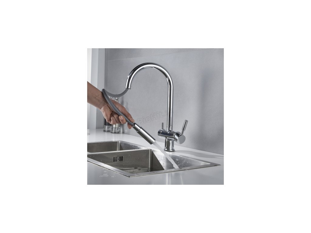 Táto moderná trojcestná kuchynská batéria je ideálnym riešením pre kuchyne vybavené domácim filtrom na vodu. Zabezpečí vám pohodlie a efektivitu vďaka vývodu na filtrovanú vodu, čím odpadá potreba dodatočnej jednocestnej batérie pri systéme reverznej osmózy.