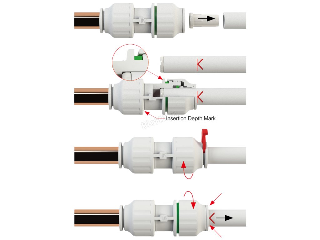 Pri úplnom zasunutí tvarovky zmizne zelený pásik, čo poskytuje okamžitú vizuálnu kontrolu správneho spojenia.